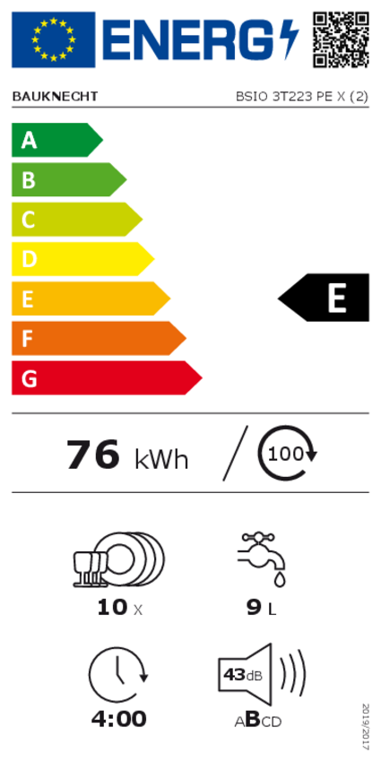 - Energieeffizienzklasse E, Reinigungsleistungsindex 1,13, Trocknungsleistungsindex 1,07**